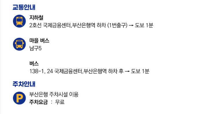 부산은행 본점 인근에는 여러 주차장이 있으며, 주차 요금은 시간당 약 3,000원입니다. 공연 당일에는 주차장이 매우 혼잡할 수 있으므로, 가급적 대중교통을 이용하시거나 미리 주차 공간을 확보하는 것이 좋습니다. 또한, 공연 시작 최소 30분 전에 도착하는 것을 추천드립니다.