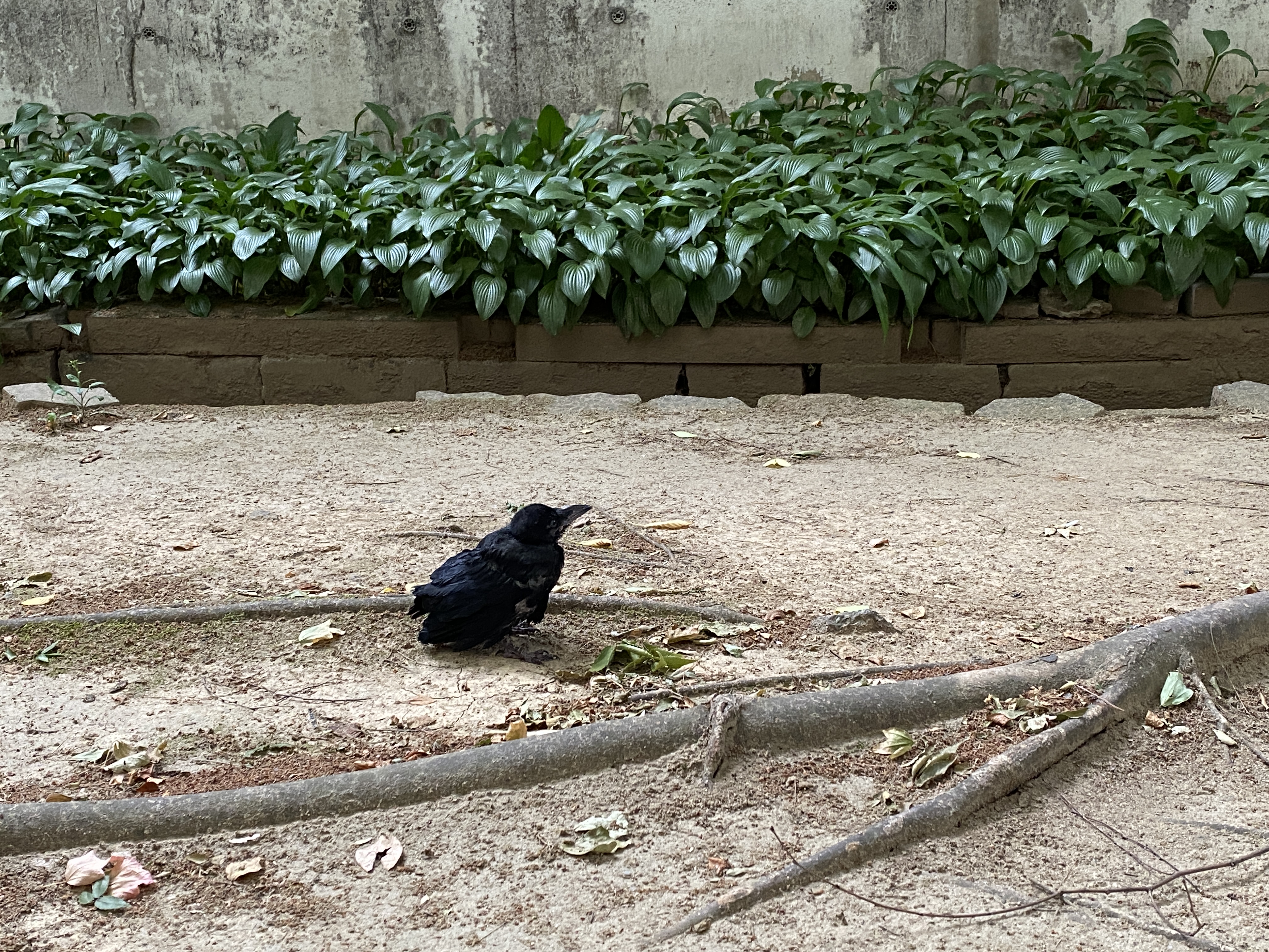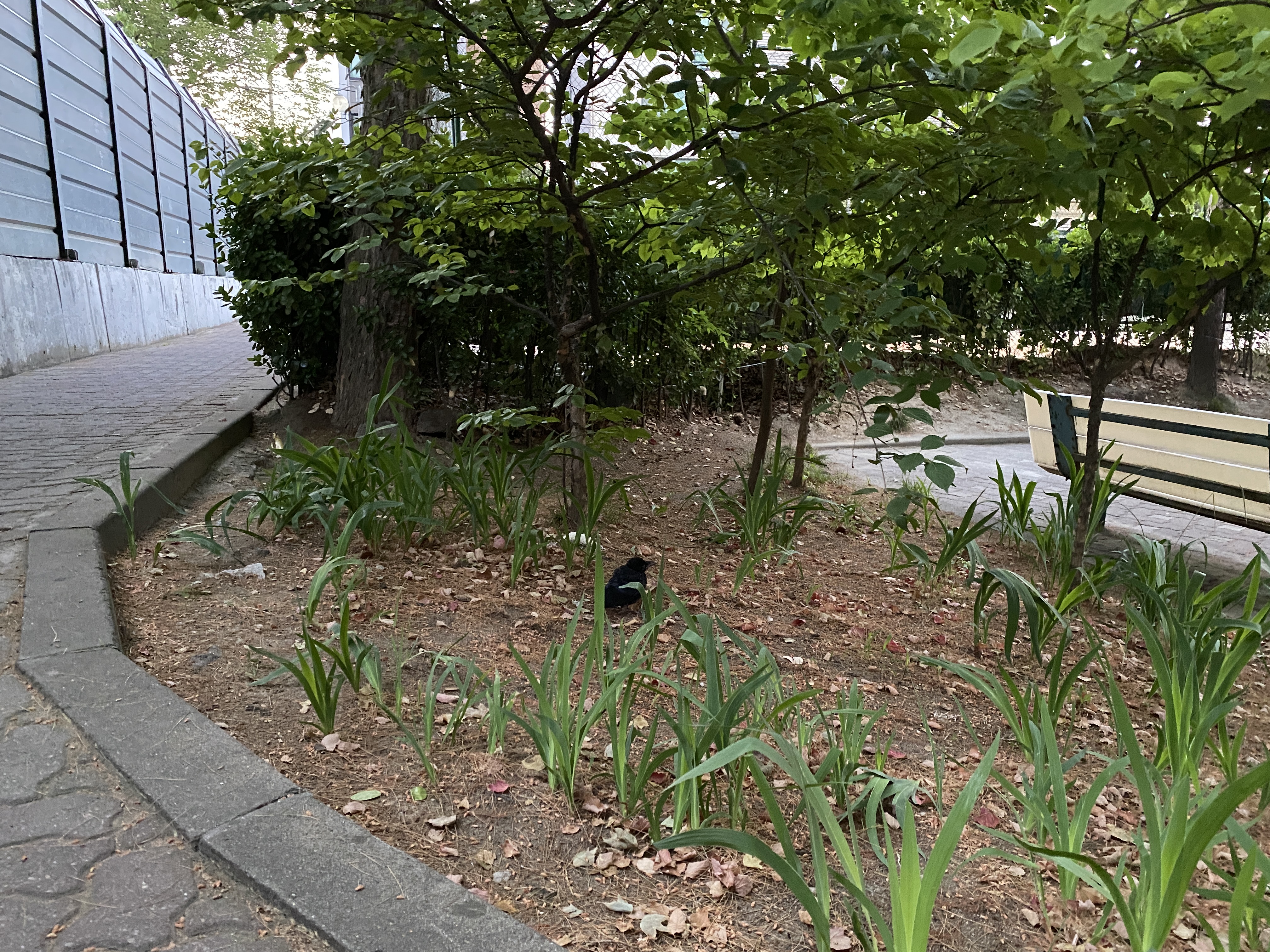 그러다가, 그래 일단 차도 쪽으로 가는 것이라도 방지하자 라는 마음에 차음벽 너머 아파트 쪽으로 가서 아파트 화단에 다시 내려놨죠. 그런데 이때도 ㅠㅠ 어미 까마귀가 안 데려 가는 겁니다..