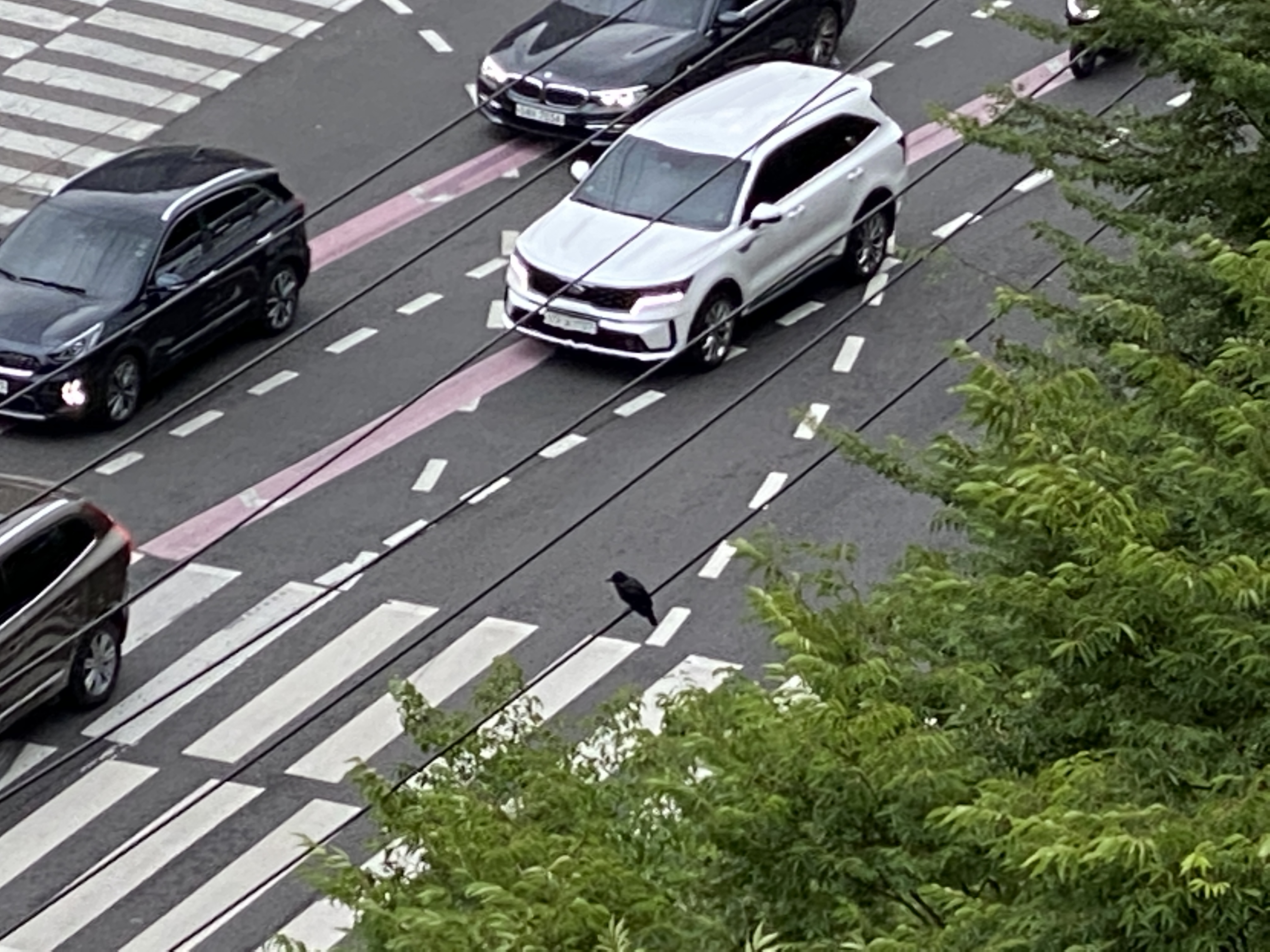 저쪽 횡단보도에서 보행신호를 기다리는데 차들이 무언가를 피해서 다니는걸 보았습니다. 자세히 보니 새끼까마귀가 날지도 못하고 횡단보도 한 가운데에 앉아있더라고요.