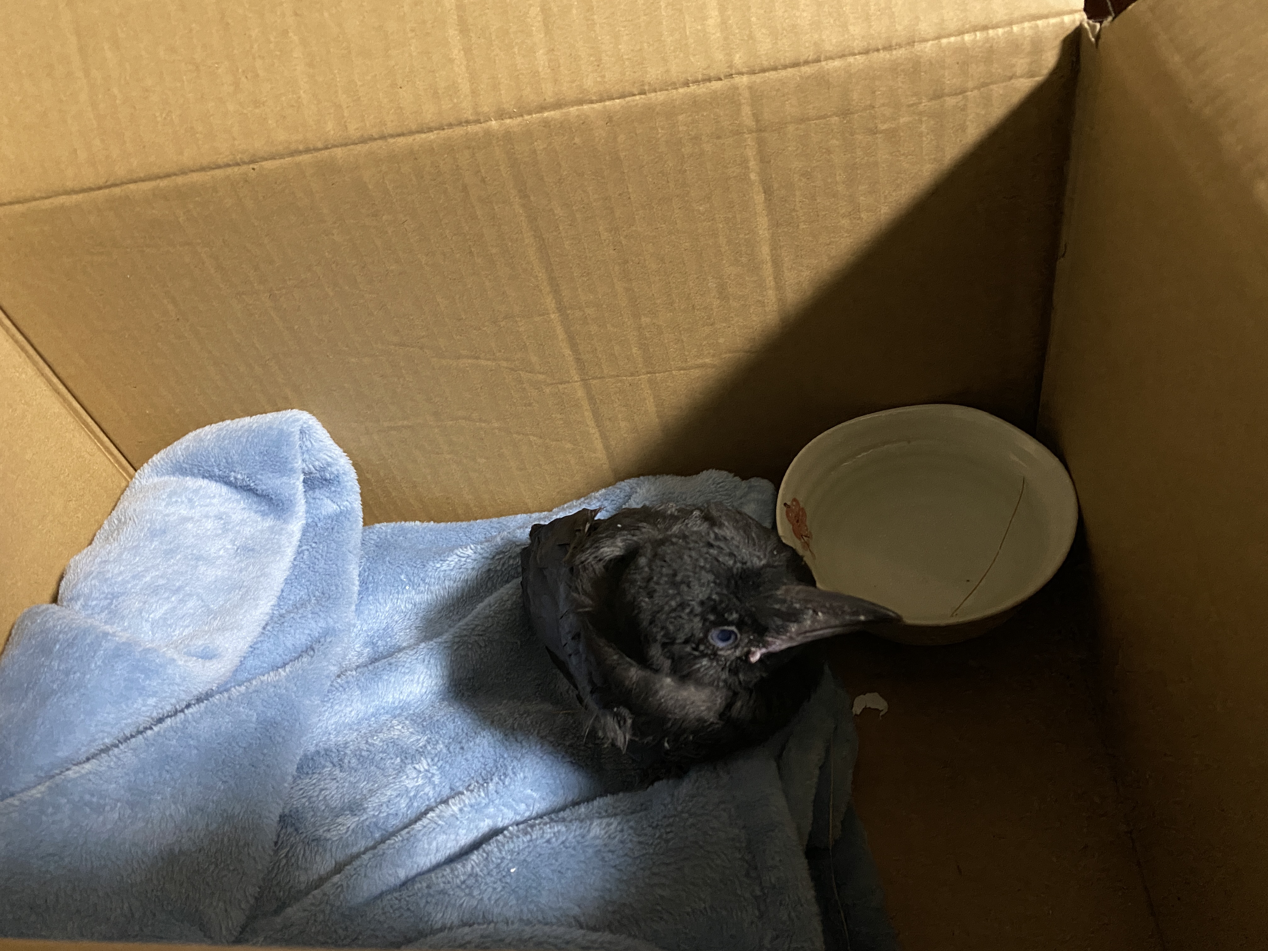 저는 깜짝 놀라서 신호가 바뀌자마자 가서는 새끼 까마귀를 덥석 잡아 제 가방 속에 넣어서 도로가를 벗어났습니다.