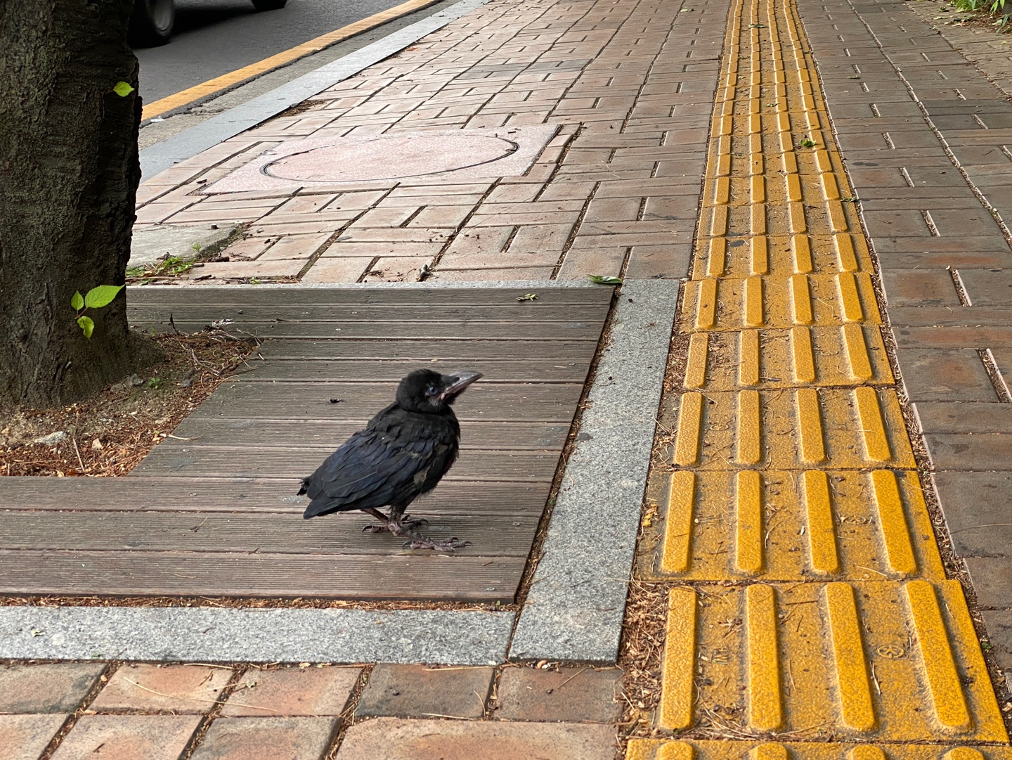 그 뒤 새끼까마귀를 인도에 내려놓았는데 ㅠㅠ 계속 날지 못하고 차도 쪽으로 내려가려고 하고.. 사람들이 자꾸 지나다니니 어미까마귀는 위에서 깍깍 거리기만 할 뿐 오지도 못하고..너무 걱정되서 20분은 보고만 있었습니다.
