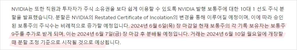 엔비디아는 2024년 5월 22일 24년 1분기 실적보고서에서 무려 10:1의 선물 주식 분할을 발표함. 주식을 1주 가지고 있다면 9주를 추가로 받을 수 있다는 뜻임. 일정까지 나옴.