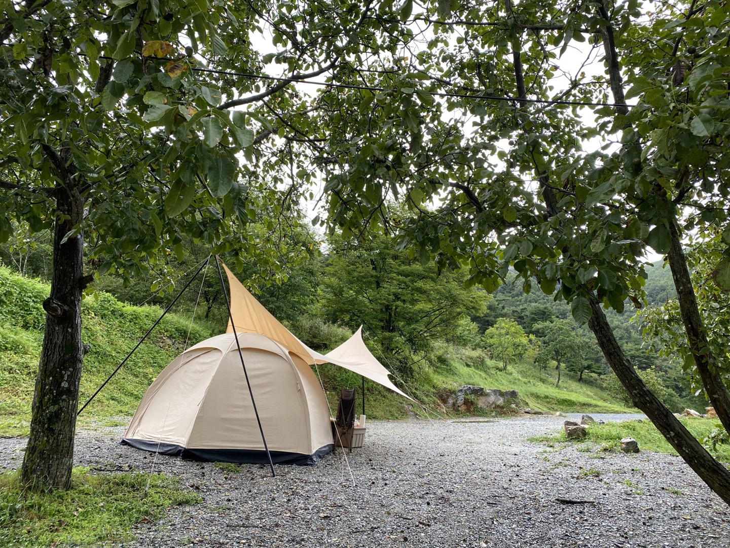 두 번째 캠핑은 평창이었는데 이곳에서는 낮부터 비가 억수로 쏟아졌습니다. 비 오는 날 무거운 면타프와 면텐트를 친다고 고생했던 기억이 있네요.이 날 역시 타프와 텐트에 비가 들이쳤는데 방수 성능은 뛰어났고 아무런 문제 없이 캠핑을 마쳤습니다.